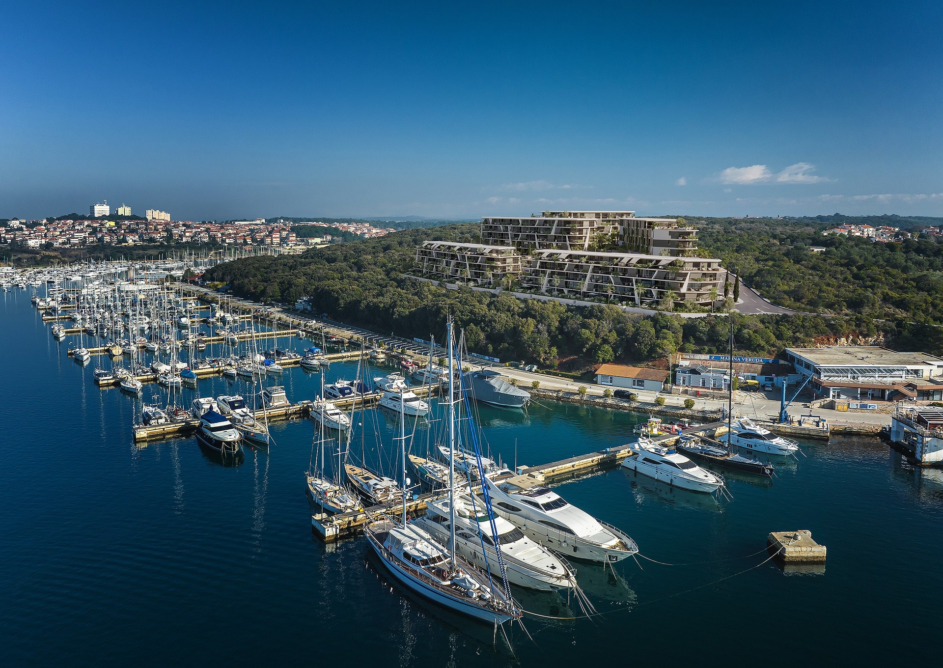 MARINA SKY is an exclusive 3D visualization project showcasing a collection of luxury apartments situated in one of the most prestigious locations in Pula – a serene green zone positioned just above Marina Veruda. The development consists of five elegantly designed buildings, each thoughtfully oriented to provide exceptional sea views, abundant natural light, and a refined sense of privacy.