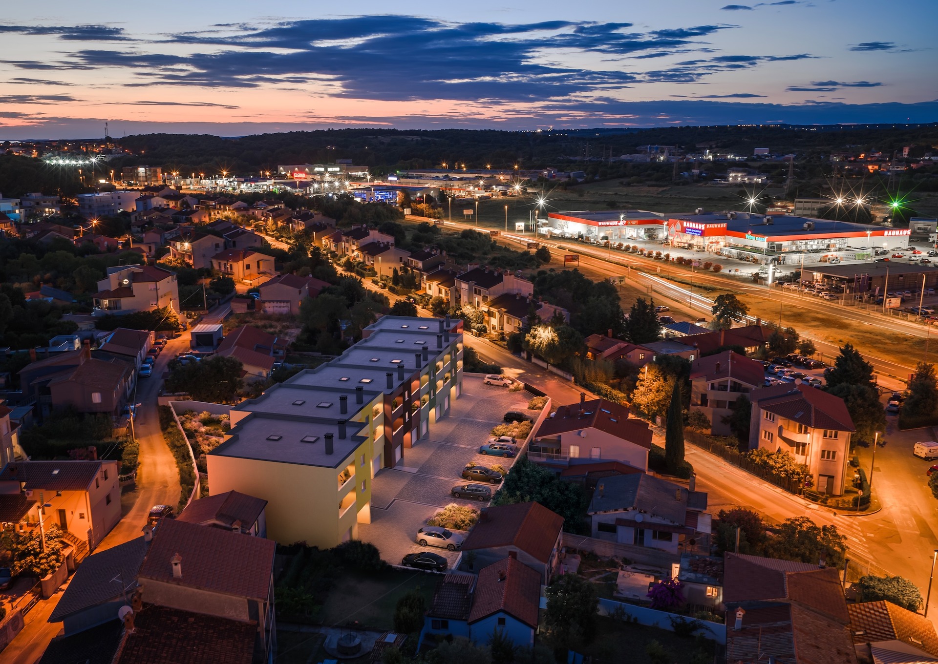 Located in the Šijana district, directly at the main entrance to the city of Pula, the project benefits from an exceptionally strategic position. The complex is surrounded by business and retail centers, providing immediate access to everyday amenities, services, and urban infrastructure, while maintaining the comfort and structure of a dedicated residential environment.